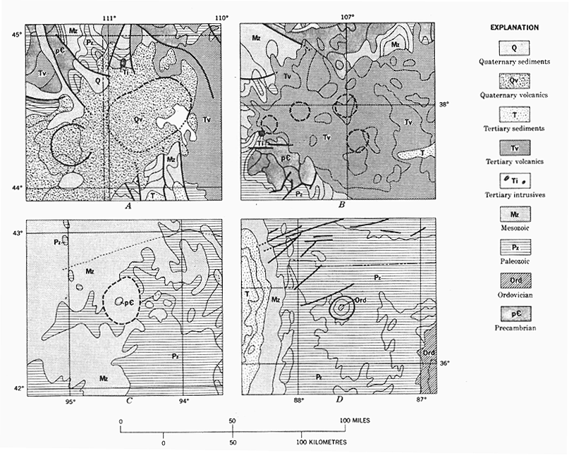 FIGURE 10.--Circular faults shown on the Geologic Map of the United States.