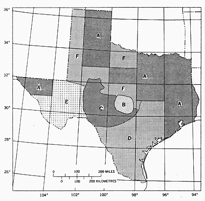 Figure 6.--Index map of Texas, showing areas covered by different sources used on the Geologic Map. Letter symbols are explained on page 16.
