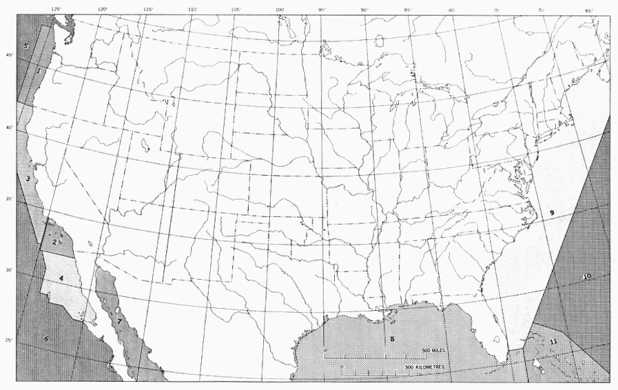 Figure 7.--Index map of the United States, showing areas covered by the different sources used for the subsea contours on the Geologic Map. Numbers are explained on page 18.